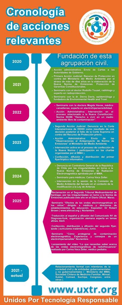 El pasado mes de enero 2025 fue publicada en el Diario Oficial una Nueva Norma de Emisión de Radiación Electromagnética la que, como es sabido, objetivamente es diferente a la que fue sometida a Consulta Ciudadana en el año 2023 y no se ajusta a los estándares que protegen la salud y la vida de las personas y de los ecosistemas. Por lo anterior, en el año 2024, el equipo UXTR preparó un documento contundente y concretó una denuncia en Contraloría General de la República, pero lamentablemente esta entidad se abstuvo de emitir un pronunciamiento.